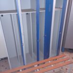 Vestiaire métal gris 4 portes bleues + 1 banc